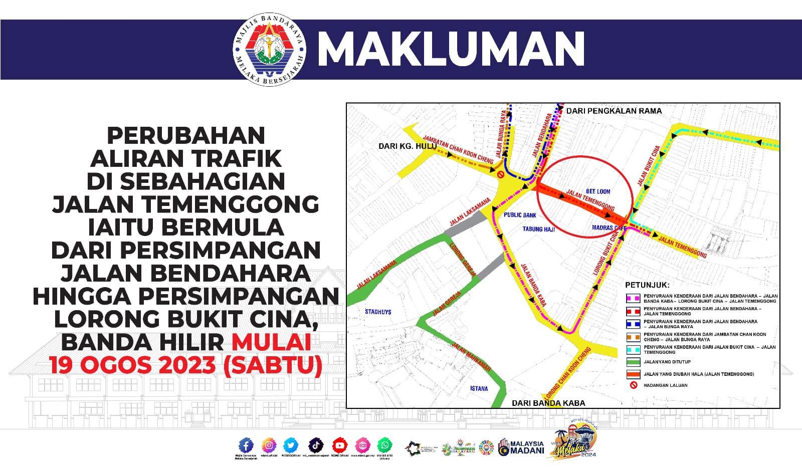 2. Perubahan aliran trafik di sebahagian Jalan Temenggong iaitu bermula dari Persimpangan Jalan Bendahara hingga Persimpangan Lorong Bukit Cina, Banda Hilir mulai 19 Ogos 2023 ( Sabtu ). Dari Jalan Bendahara, anda boleh susur ke kiri untuk ke bulatan Bukit Cina dan boleh terus ke Bangunan Tabung Haji dan boleh susur kanan ke Jalan Bunga Raya.