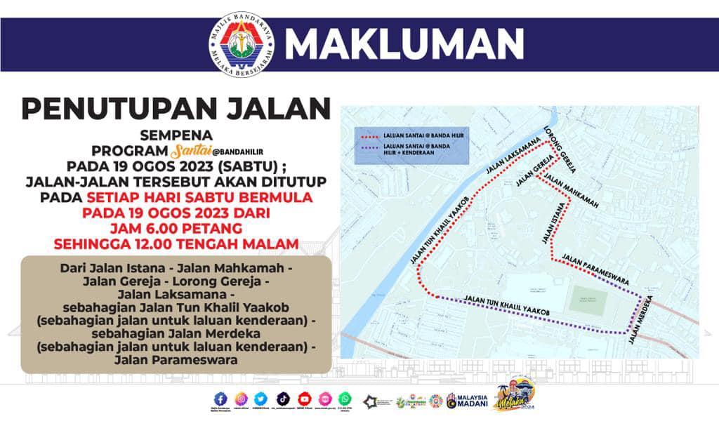 1. Sempena Program Santai@BandaHilir pada 19 Ogos 2023 ( Sabtu ) : Jalan-jalan tersebut akan ditutup pada setiap hari Sabtu bermula pada 19 Ogos 2023 dari jam 6.00 petang sehingga 12.00 tengah malam. Jalan-jalan tersebut adalah: