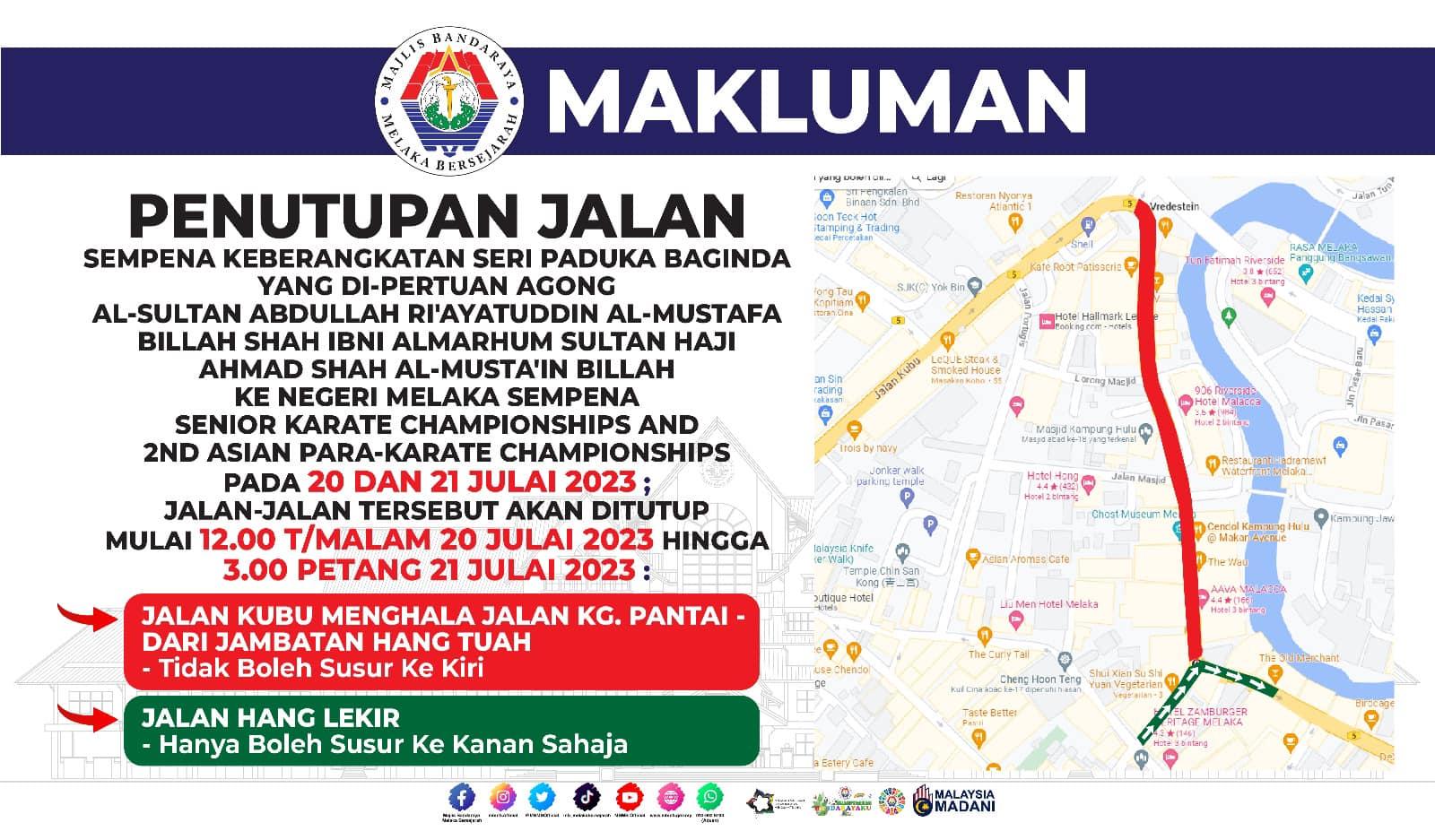Sempena Keberangkatan Seri Paduka Baginda Yang di-Pertuan Agong Al-Sultan Abdullah Ri'ayatuddin Al-Mustafa Billah Shah Ibni Almarhum Sultan Haji Ahmad Shah Al-Musta'in Billah ke Negeri Melaka sempena Senior Karate Championships and 2nd Asian Para-Karate Championships pada 20 dan 21 Julai 2023. Jalan-jalan tersebut akan ditutup mulai 12.00 tengah malam 20 Julai 2023 hingga 3.00 petang 21 Julai 2023 :
