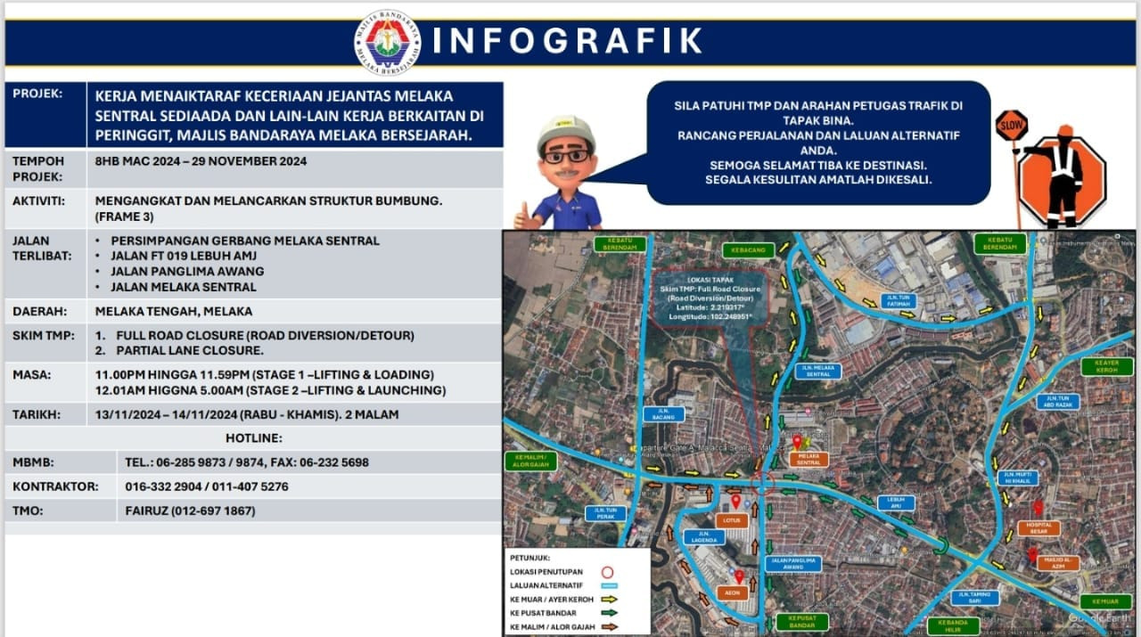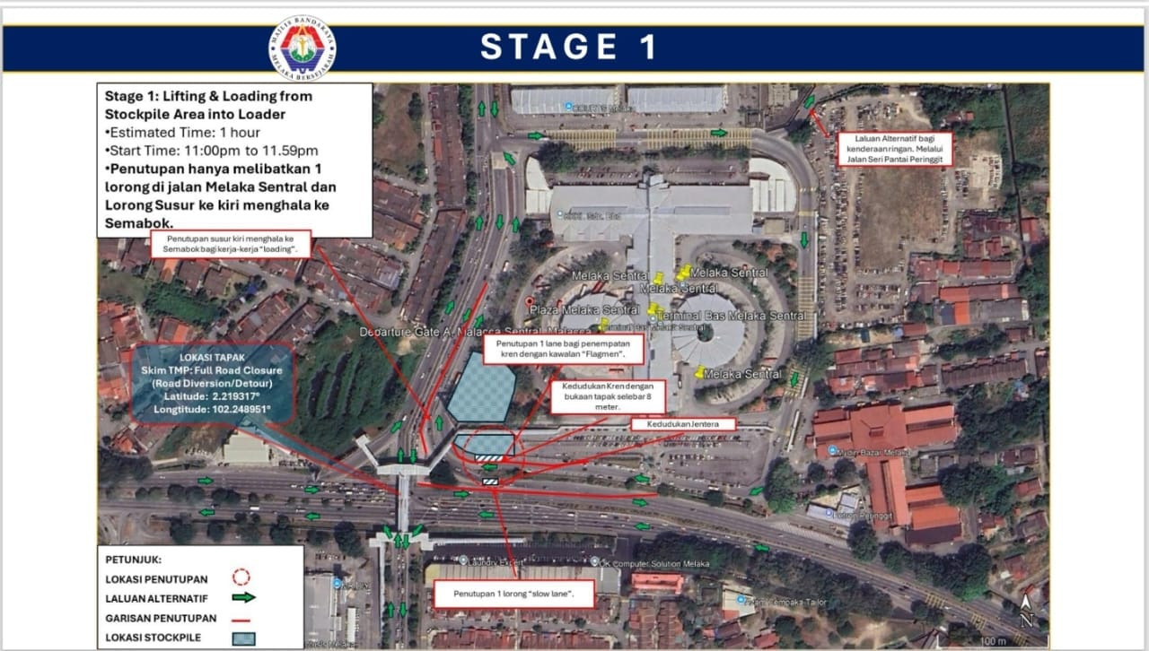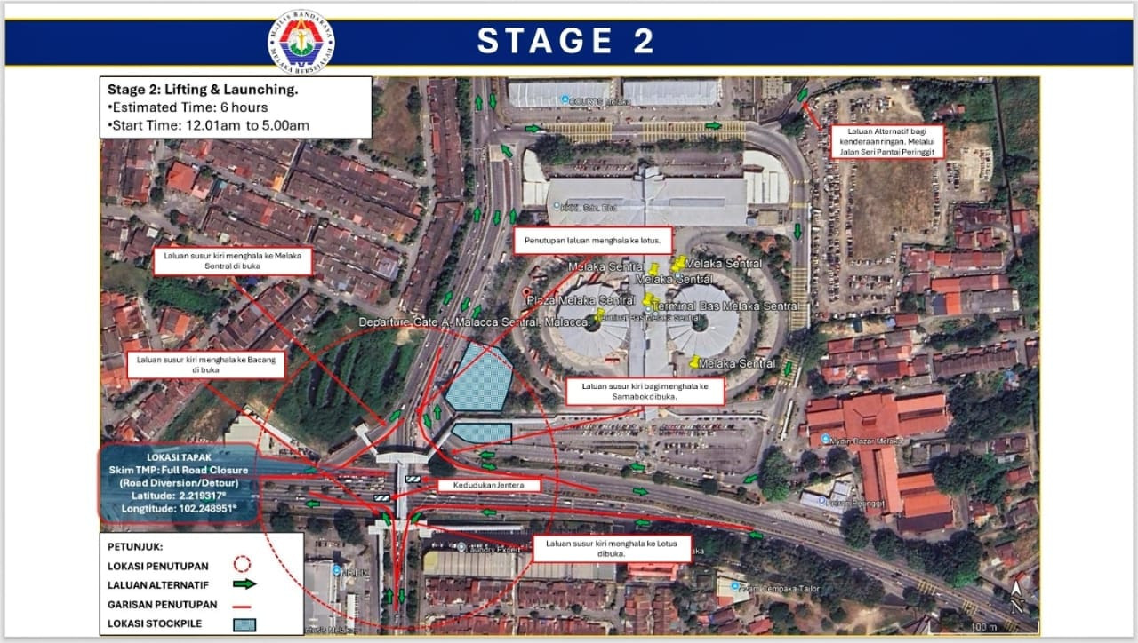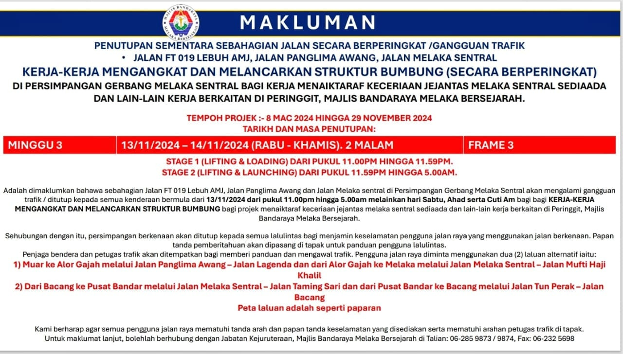 Bagi memberi laluan kepada KERJA-KERJA MENGANGKAT DAN MELANCARKAN STRUKTUR BUMBUNG (secara berperingkat) di Persimpangan Gerbang Melaka Sentral, sebahagian jalan akan ditutup seperti berikut: