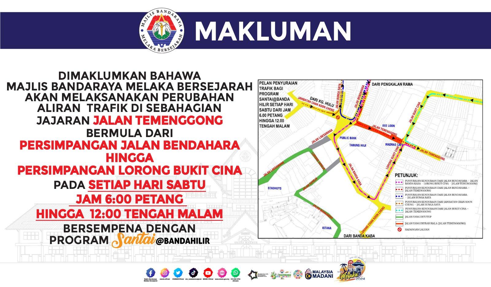 Pemakluman Mengenai Penyuraian Trafik Bagi Program Santai@Banda Hilir Setiap Hari Sabtu Dari Jam 6.00 Petang Hingga 12.00 Tengah Malam Dimaklumkan bahawa Majlis Bandaraya Melaka Bersejarah akan melaksanakan perubahan aliran trafik di sebahagian Jajaran Jalan Temenggong bermula dari persimpangan Jalan Bendahara hingga Persimpangan Lorong Bukit Cina secara berkala pada setiap hari Sabtu pada jam 6:00 petang hingga 12.00 tengah malam bersempena dengan program Santai@Banda Hilir.
