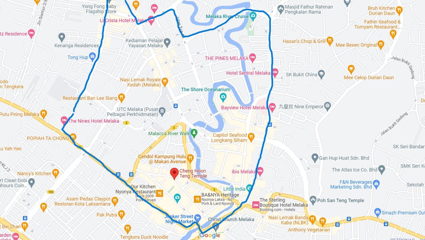 Jalan terlibat ialah Jalan Gajah Berang, Jalan Tun Perak, Jalan Tun Ali, Jalan Tun Mutahir, Jalan Tun Sri Lanang, Jalan Bendahara, Jalan Laksamana, Lorong Hang Jebat, Jalan Tun Tan Cheng Lock, Jalan Tengkera, Jalan Gajah Berang. Perarakan kereta berhias akan bermula dan tamat di Kuil Seck Kia di Gajah Berang.