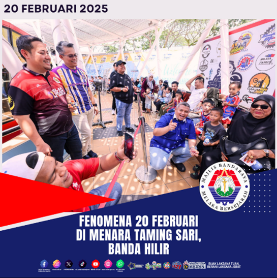 YB Datuk Rais bin Datuk Wira Yasin, EXCO Kanan Perumahan, Kerajaan Tempatan, Saliran, Perubahan Iklim dan Pengurusan Bencana turut turun padang menyantuni pengunjung yang berkunjung ke Menara Taming Sari di samping mengagihkan makanan secara percuma. Turut hadir, YAB Datuk Seri Utama Ab Rauf bin Yusoh, Ketua Menteri Melaka meninjau dan beramah mesra dengan para pengunjung.