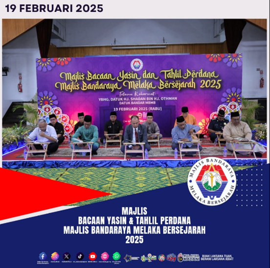 19 Februari - Majlis Bacaan Yasin dan Tahlil Perdana Majlis Bandaraya Melaka Bersejarah 2025 telah diadakan di Dewang Taming Sari, MBMB anjuran Kelas Agama dan Motivasi MBMB.