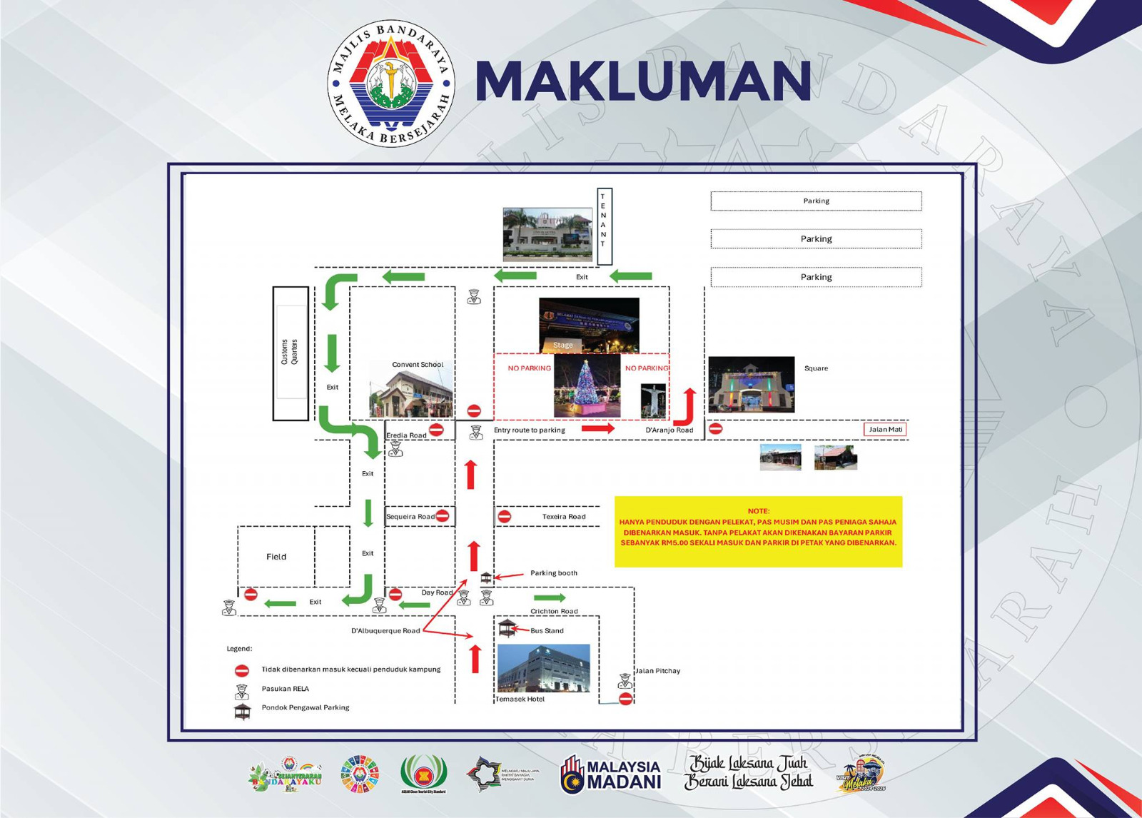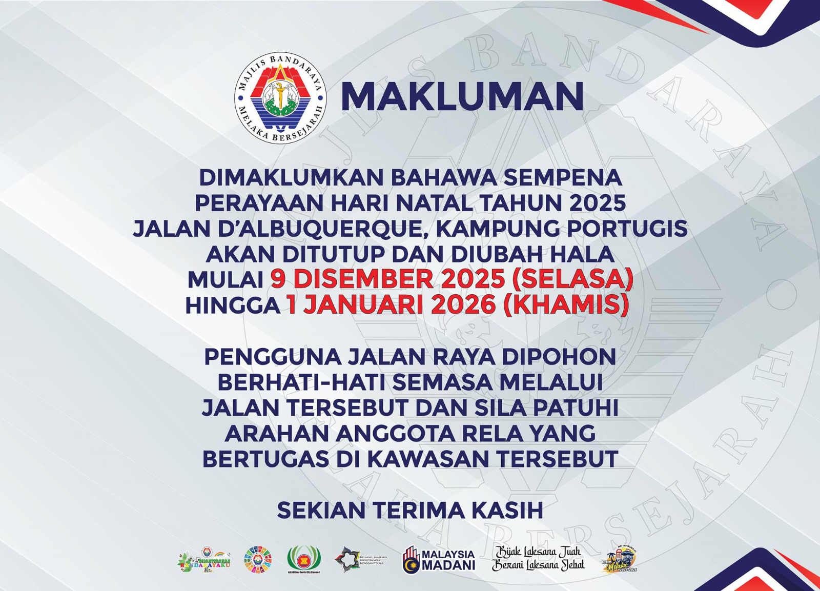 Dimaklumkan Bahawa Sempena Perayaan Hari Krismas Tahun 2025 Jalan D’albuquerque, Kampung Portugis Akan Ditutup Dan Diubah Hala Mulai 9 Disember 2025 (Selasa) Hingga 1 Januari 2026 (Khamis).